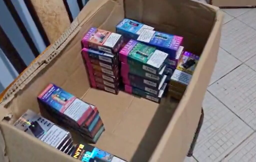 No local, os agentes apreenderam dezenas de cigarros eletrônicos, aparelhos celulares e bebidas estrangeiras sem comprovação de origem.