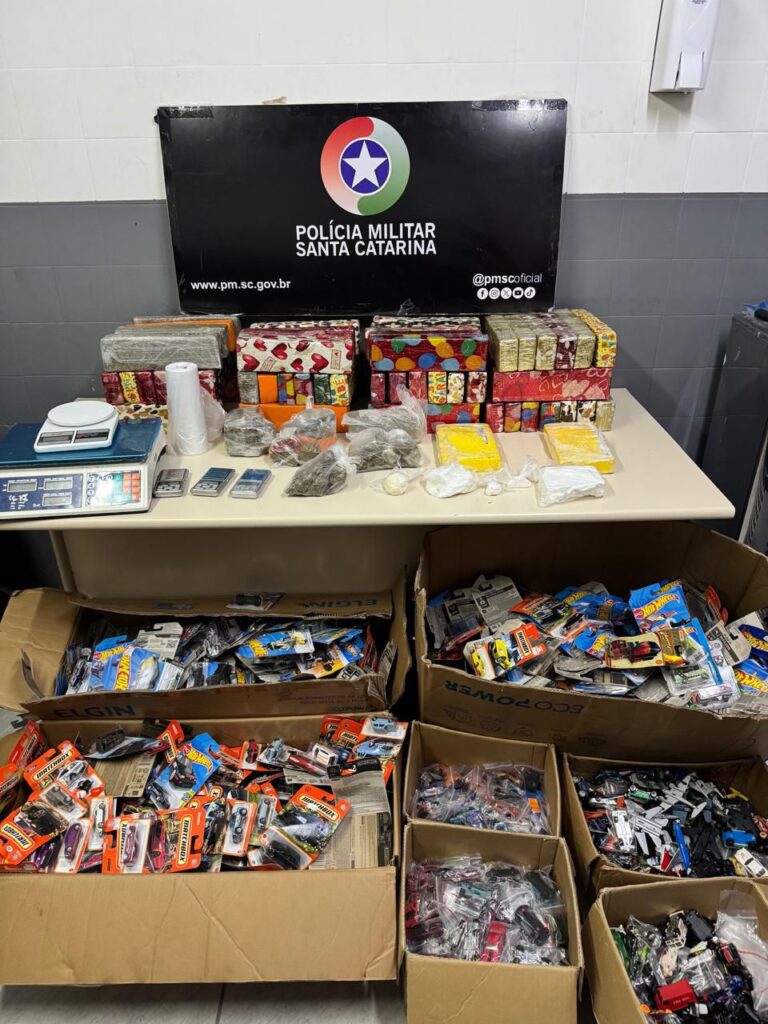 Após abordagem e diligências, os policiais identificaram os suspeitos e localizaram aproximadamente 45 quilos de maconha, 2,5 quilos de cocaína e 37 gramas de crack. Também foram apreendidas balanças de precisão e aparelhos celulares.