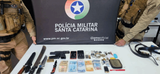 Durante a abordagem, os policiais encontraram armas brancas e, em varredura na rota de fuga, localizaram uma pistola Taurus G3, calibre 9mm, com registro de furto em Xaxim. Ao todo, foram apreendidos uma pistola, 11 munições intactas, 3 deflagradas, quatro armas brancas, dois celulares e o veículo Logan.