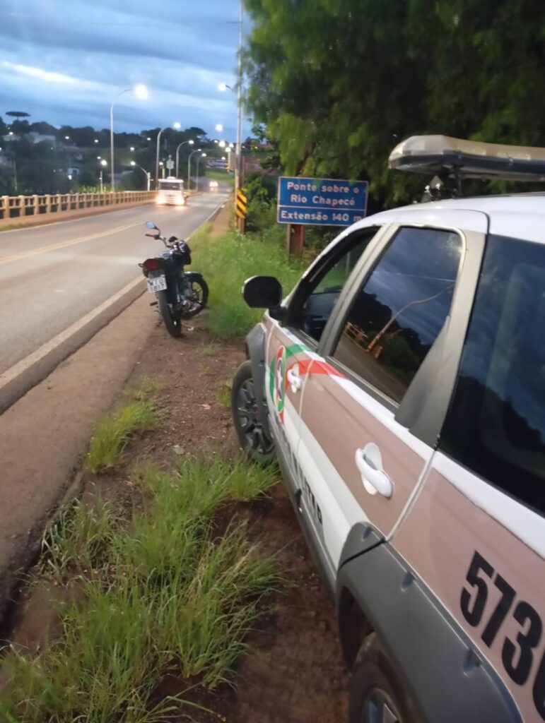 A moto foi visualizada em deslocamento pela rodovia e interceptada próximo à Ponte do Rio Chapecó, no bairro Vila Ceres. Dois jovens, de 20 e 22 anos, estavam no veículo no momento da abordagem.