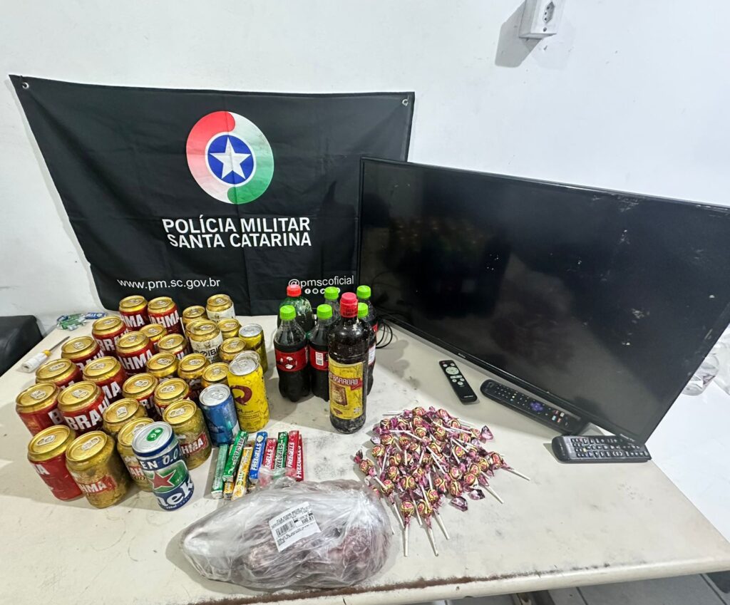 Foram recuperados diversos objetos furtados, entre eles bebidas, doces, refrigerantes, uma peça de carne tipo filé mignon e uma televisão da marca Philco.