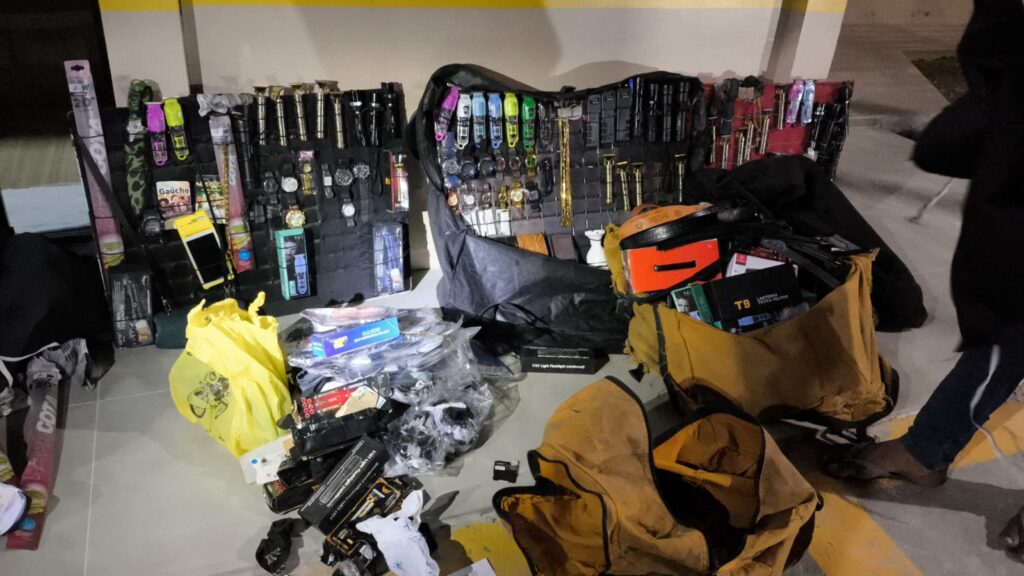 Durante a vistoria minuciosa no interior do carro, os policiais encontraram diversos produtos de procedência estrangeira — entre eles cuecas, meias, barbeadores, relógios, caixas de som, lanternas, câmeras de segurança, carteiras, facas e correntes — todos sem documentação fiscal.