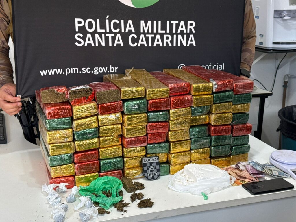 Nas buscas realizadas no local, os policiais apreenderam aproximadamente 55 quilos e 920 gramas de maconha, 602 gramas de cocaína, uma balança de precisão e um aparelho celular. Segundo a PM, os dois homens assumiram a posse dos entorpecentes.