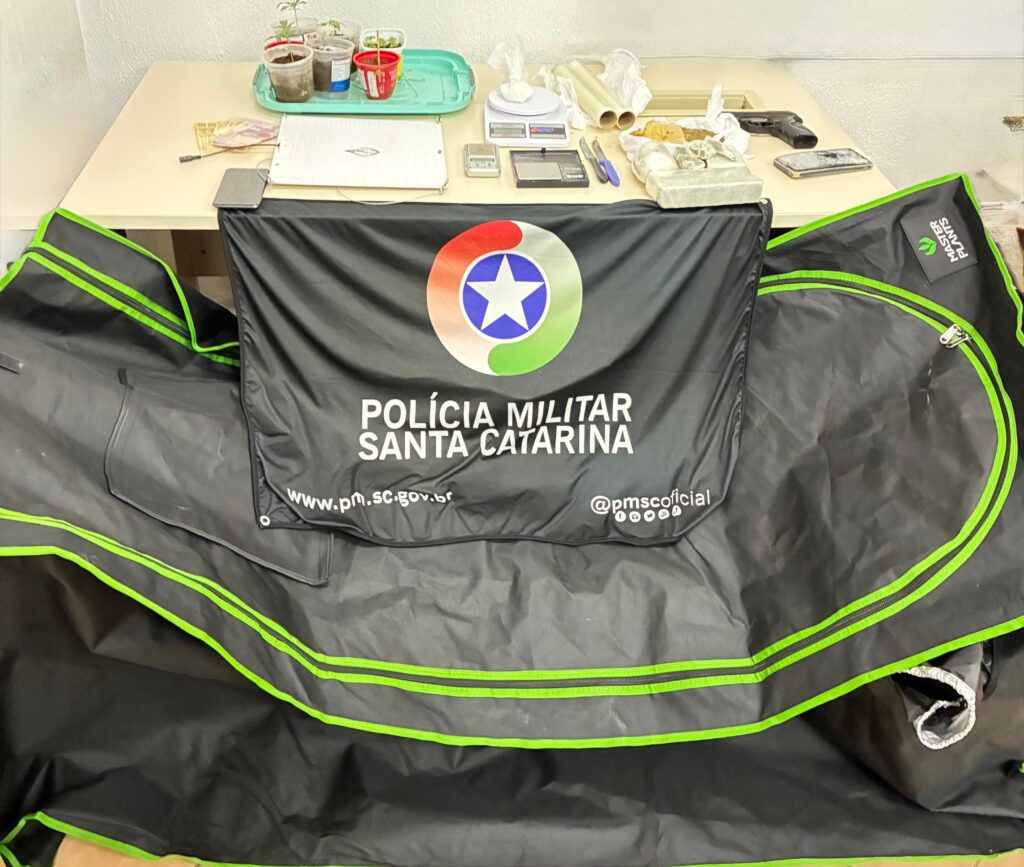 Diante da situação, os militares acessaram o imóvel e encontraram o principal suspeito, que tentou destruir um celular ao perceber a chegada da PM. No local, foram apreendidas porções de maconha e cocaína, três balanças de precisão, uma estufa de cultivo com quatro pés de maconha e um simulacro de arma de fogo.