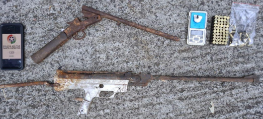 Na continuidade da diligência, também foram encontradas 70 cápsulas deflagradas de munição calibre 9 milímetros, além de uma garrucha e uma carabina, ambas com calibre não identificado.
