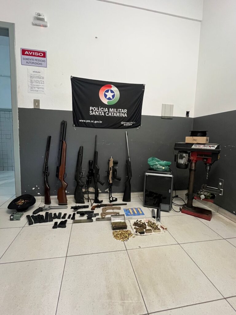 Segundo a corporação, no local foram encontradas 10 armas de fogo prontas ou em fase de montagem, além de mais de 500 munições de diversos calibres. As guarnições também apreenderam equipamentos utilizados para a fabricação e recarga, bem como uma caixa de isolamento acústico usada para testes de disparo.