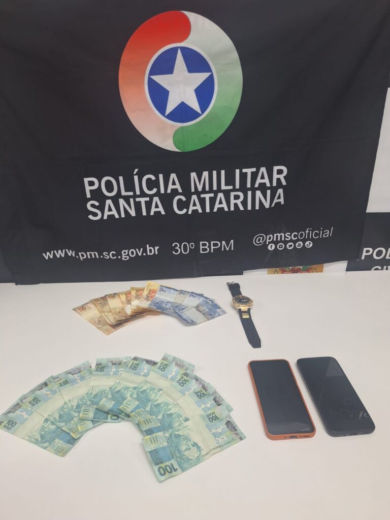 Na ação, foram apreendidos R$ 900,00 em cédulas falsas de R$ 100,00, R$ 218,00 em dinheiro proveniente de trocos das compras realizadas, dois aparelhos celulares e um relógio que teria sido adquirido com o valor ilícito.
