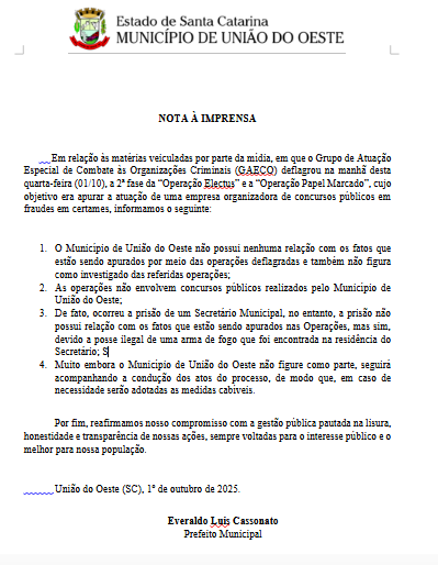 A Prefeitura de União do Oeste emitiu uma nota oficial, na qual informa que está acompanhando o caso e colaborando com as investigações. Vale ressaltar que a prisão do servidor de União do Oeste, se deve a porte ilegal de arma de fogo.