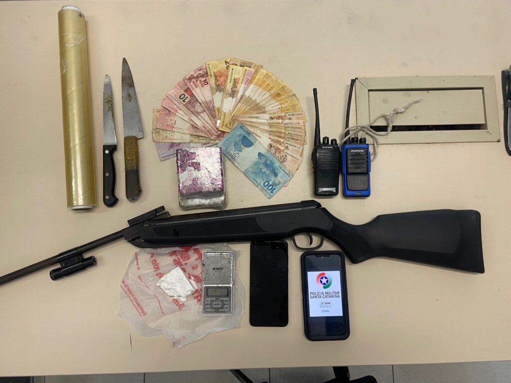 Ao todo, foram apreendidos 61,9g de cocaína, 482g de maconha, uma balança de precisão, dois rádios comunicadores, R$ 1.252,00 e uma espingarda de pressão calibre 5.5.