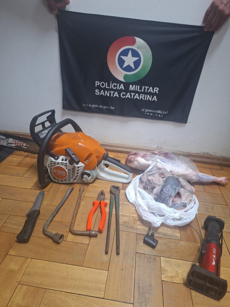 O abordado admitiu ter pego um alicate, uma chave tipo cachimbo e uma chave de rodas, alegando que a motosserra permaneceu no local. Durante a revista pessoal, os policiais encontraram uma mochila com diversos objetos, entre eles alimentos congelados, ferramentas e uma faca com cabo preto e parte da lâmina danificada.