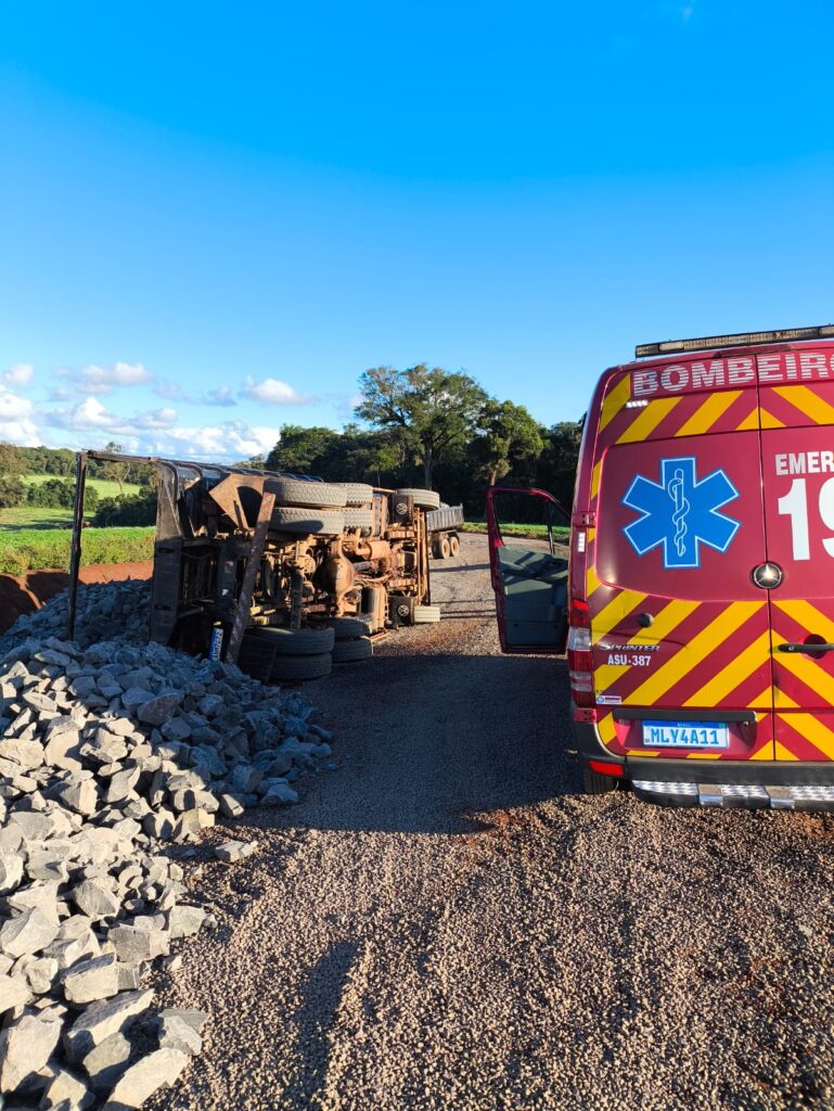 O caminhão, do tipo caçamba, teria tombado durante uma manobra. O motorista, um homem adulto, apresentava um ferimento corto-contuso na região da cabeça, com hemorragia ativa. Apesar disso, ele estava consciente, orientado e com sinais vitais estáveis.