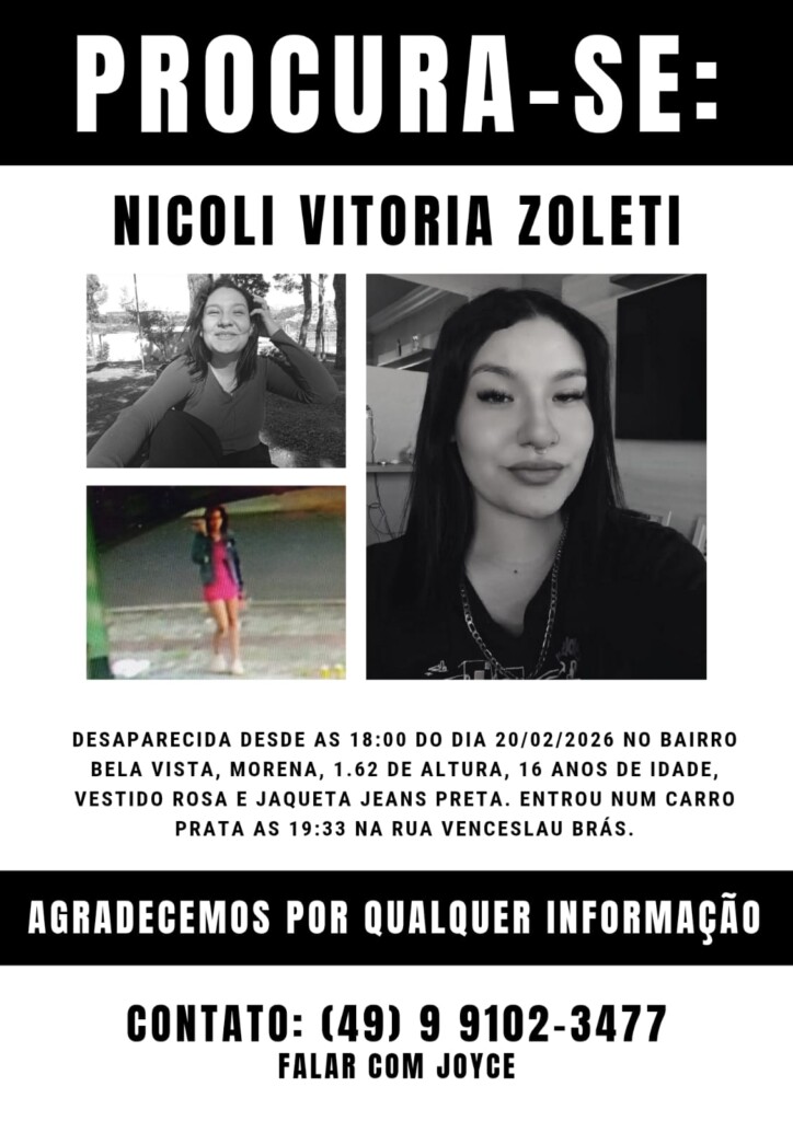 A comunidade está mobilizada na busca por Nicolí Vitoria Zoleti, de 16 anos, que está desaparecida desde a última terça-feira (20). A situação é de extrema preocupação, pois a jovem perdeu a mãe há apenas 30 dias.