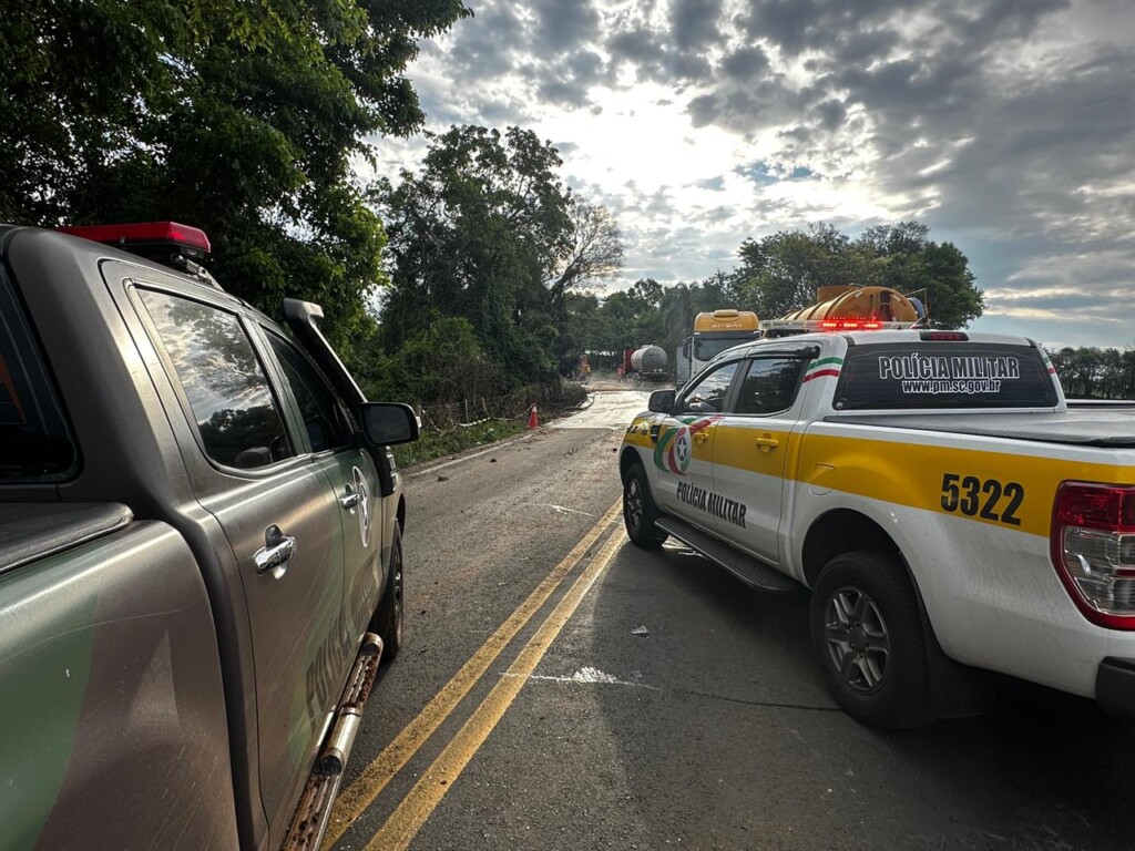A Polícia Militar Rodoviária (PMRv) informou na manhã deste domingo (05) que a rodovia SC-157, na altura do Km 171,400, em Coronel Freitas, opera em sistema de “siga e pare”. A medida é para a limpeza da pista após um acidente ocorrido na última sexta-feira (03), que envolveu duas carretas, sendo uma delas tracionada com um tanque de combustível.