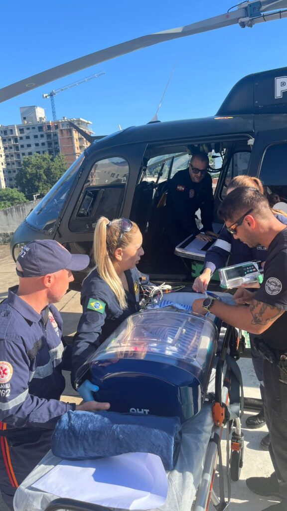 A aeronave da Polícia Civil, tripulada pelos policiais do SAER-Fron e pela equipe do SAMU/Aeromédico, foi acionada para dar suporte à equipe do Arcanjo 08 na transferência da paciente até Joinville, onde a recém-nascida é aguardada para avaliação médica e possível cirurgia de correção do defeito cardíaco.