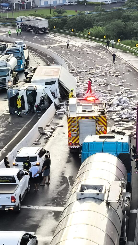 Com o impacto, grande parte da carga ficou espalhada sobre a rodovia, o que comprometeu o fluxo de veículos e exigiu atenção redobrada dos motoristas que passavam pelo trecho.