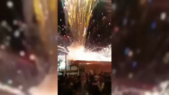 Imagens registradas por participantes mostram os fogos explodindo a partir do telhado de um imóvel localizado em frente à praça, lançando chamas e estilhaços em direção às pessoas e também contra veículos estacionados, que sofreram danos.