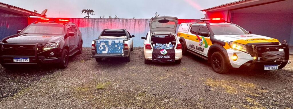 Durante a ação, foram apreendidos 13.500 maços de cigarros estrangeiros e R$ 37 mil em espécie, além de dois veículos utilizados no transporte da carga – um Fiat Strada e um Volkswagen Gol, registrados em Caçador e Santa Cecília (SC). Dois homens, de 39 e 42 anos, que conduziam os veículos, foram presos em flagrante.
