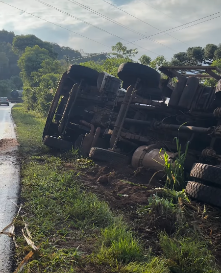Um caminhão carregado com ração tombou às margens da SC-155 na manhã deste sábado, 7, no trecho entre os municípios de Seara e Xavantina, no Oeste de Santa Catarina. O acidente aconteceu próximo à entrada da linha São Rafael, em um ponto da rodovia conhecido pelas várias curvas.