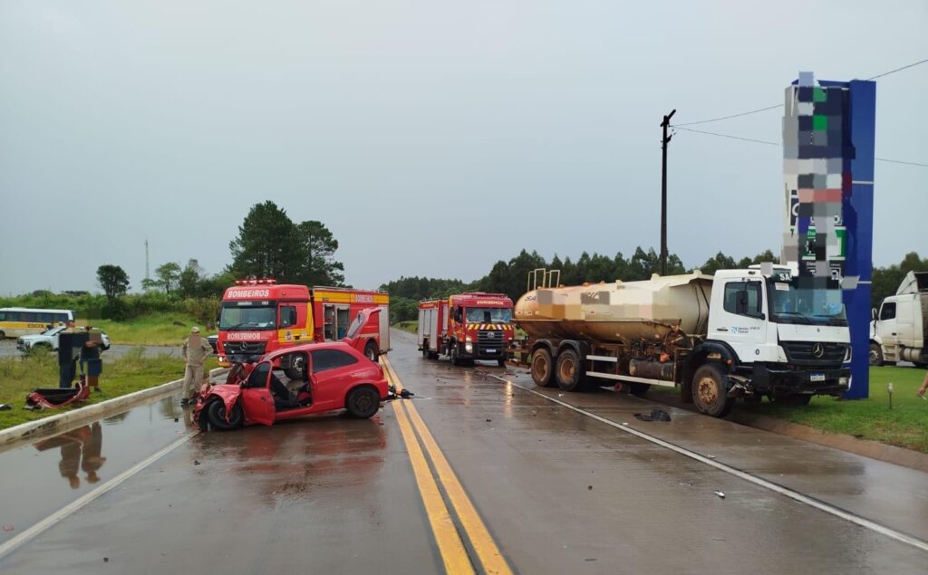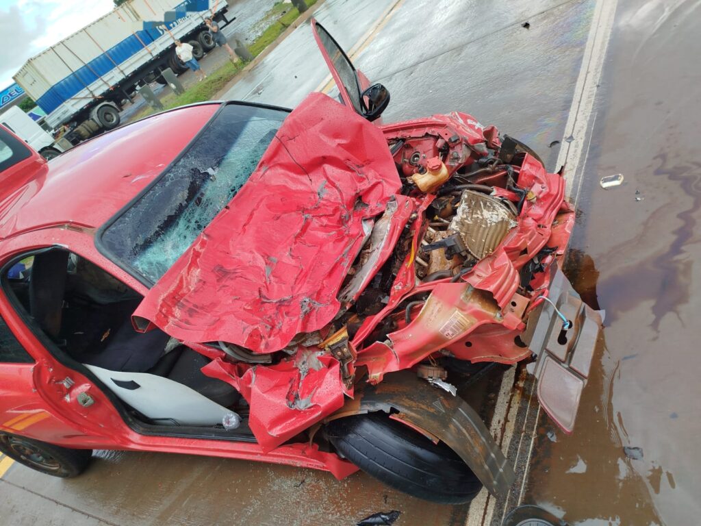 De acordo com o Corpo de Bombeiros Militar, o veículo GM/Celta colidiu lateralmente contra um caminhão e, em seguida, bateu frontalmente contra um segundo caminhão. No automóvel estavam duas vítimas.