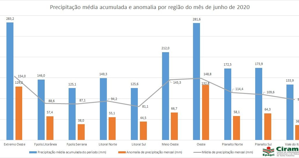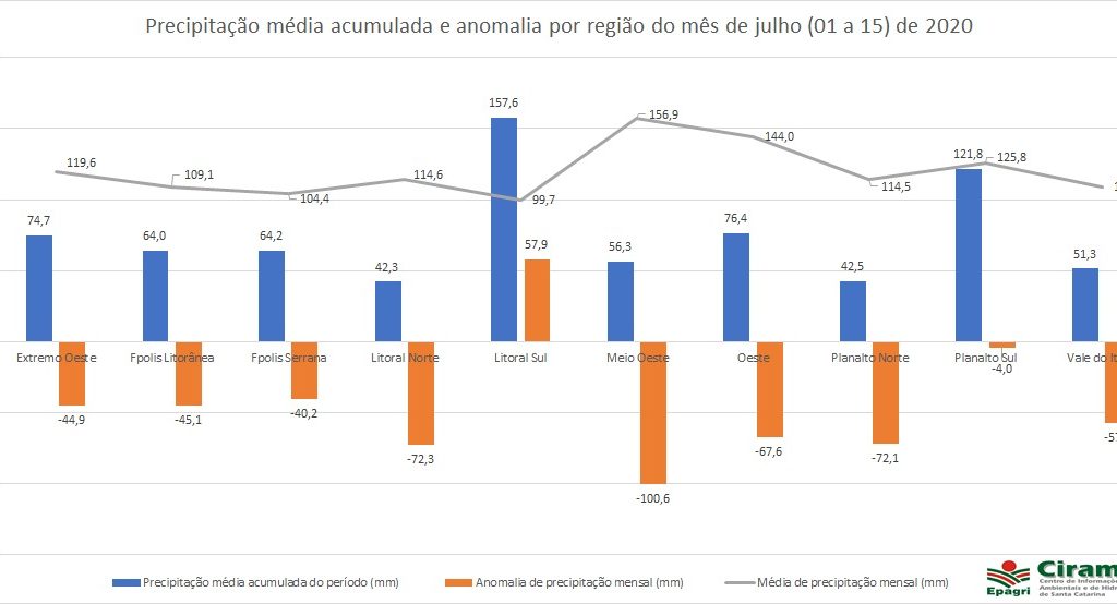 Entre junho e julho, a chuva superou a média prevista em algumas regiões, como aponta a Centro de Informações de Recursos Ambientais e de Hidrometeorologia de Santa Catarina (Epagri/Ciram) – o que ajudou na recuperação dos rios em Santa Catarina. O Lajeado São José, que abastece Chapecó, recuperou o nível e em alguns momentos chegou a verter na barragem de captação.