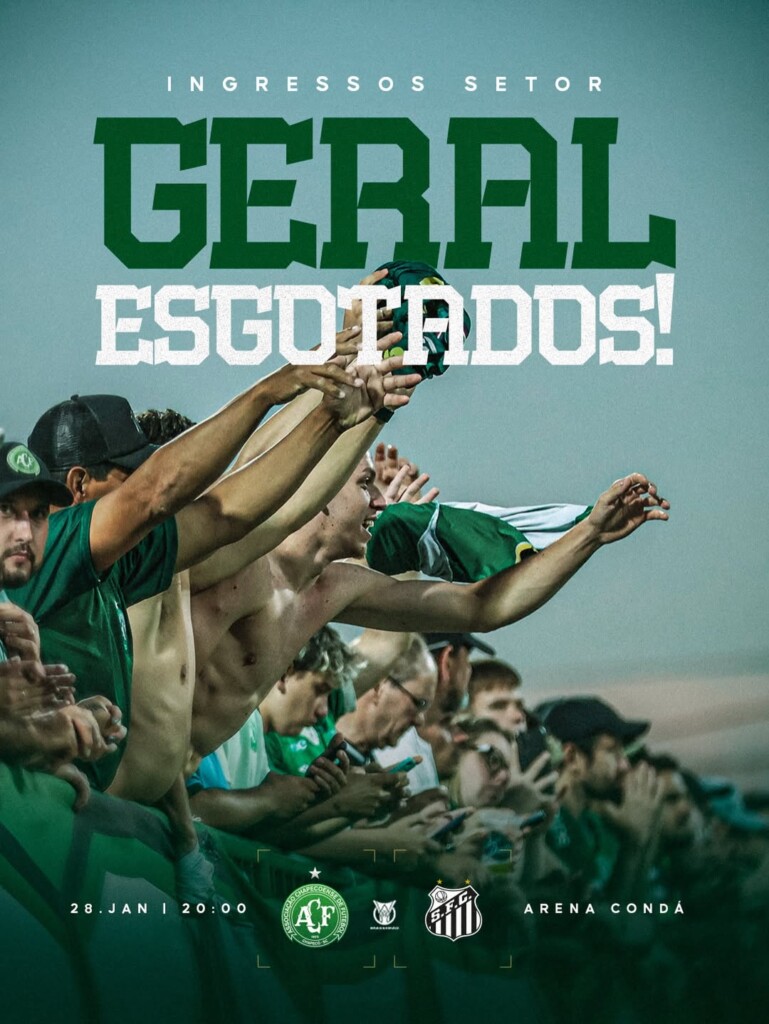 Os ingressos para a arquibancada Geral — setores Norte e Leste — estão esgotados para o confronto entre Chapecoense e Santos, válido pelo Campeonato Brasileiro. A partida será disputada nesta quarta-feira (28), às 20h, na Arena Condá, em Chapecó, e a alta procura reflete a expectativa da torcida para o duelo.