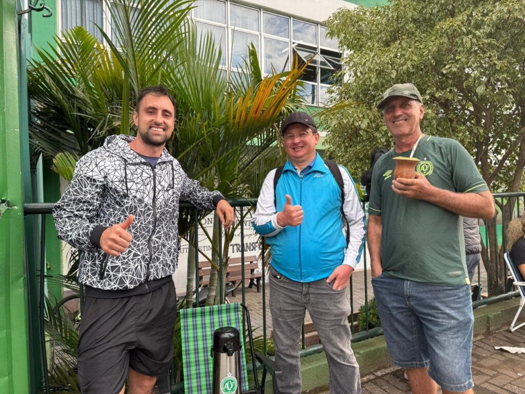 Já na metade da fila, que se estende quase até a esquina da rua Ivo Silveira, outro grupo mantinha a espera desde o início da manhã. Desde as 5h30, Daniel, João e Cledson acompanhavam a movimentação enquanto tomavam chimarrão. Daniel, que é sócio do clube, buscava ingressos para os filhos, que, segundo ele, já nasceram torcedores da Chapecoense.