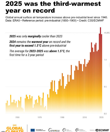 Embora 2025 tenha sido ligeiramente mais frio que 2023, 2024 permanece como o ano mais quente já registrado, sendo o primeiro a ultrapassar a marca de 1,5°C acima do período pré-industrial. A temperatura global anual permanece consistentemente acima do nível pré-industrial desde 1940, evidenciando a tendência de aquecimento a longo prazo.