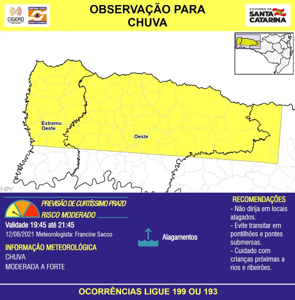 OBSERVAÇÃO – 12/08 19:45 – CHUVA de intensidade moderada a forte, com ALAGAMENTOS pontuais, para as regiões do Extremo Oeste, Oeste e Meio-Oeste nas próximas 2 horas. Ocorrências ligue 199 ou 193.