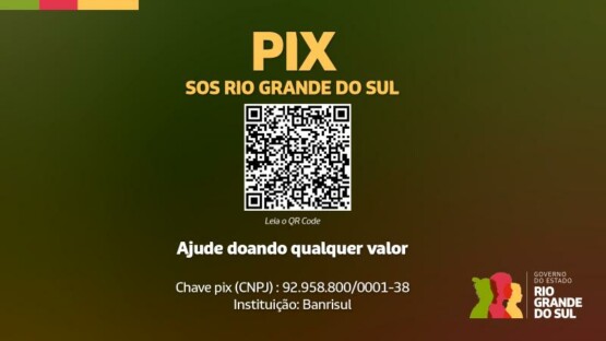 Diante da situação de calamidade pública enfrentada no Estado, o governo gaúcho reativou o canal de doações para a conta SOS Rio Grande do Sul. Foi restabelecida a chave Pix (CNPJ: 92.958.800/0001-38), a mesma utilizada no ano passado, vinculada à conta bancária aberta pelo Banrisul. As contribuições em dinheiro podem ser feitas por pessoas físicas e jurídicas que tenham condições de ajudar as vítimas das enchentes.