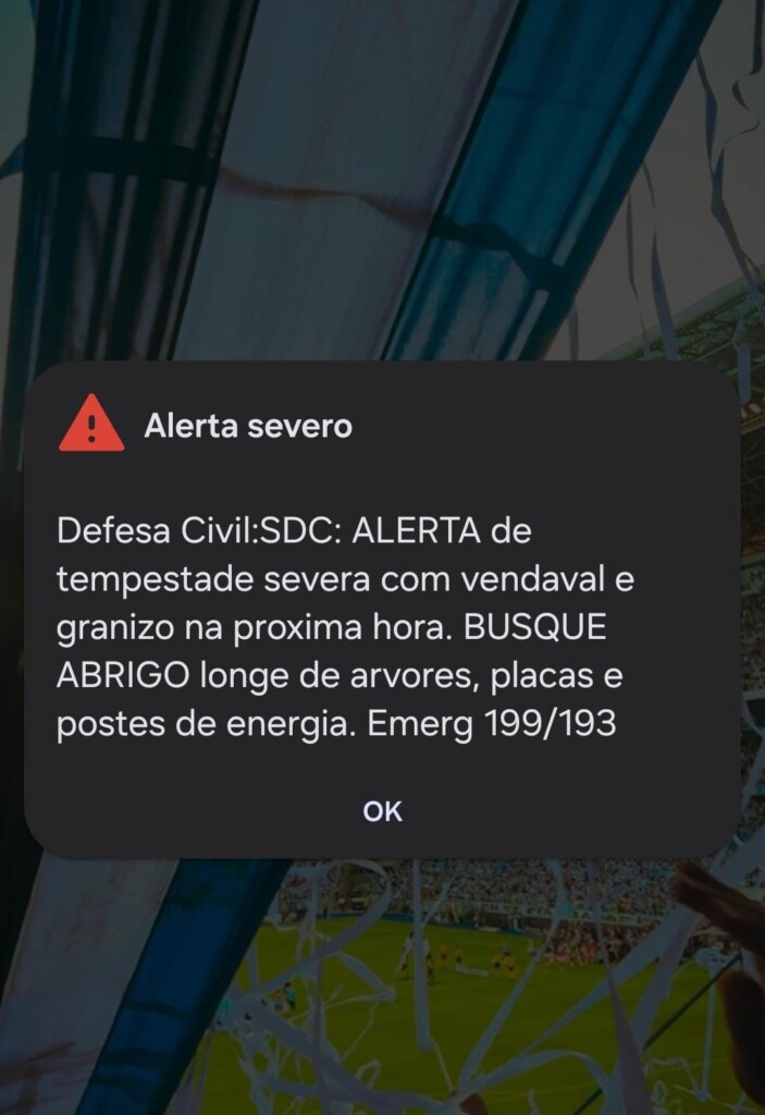 “Alerta de tempestade severa com vendaval e granizo na próxima hora. Busque abrigo longe de árvores, placas e postes de energia. Emergência 199/193”, fala o alerta.