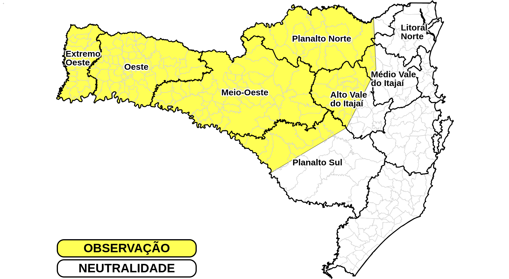 Previsão: A partir da tarde desta quarta-feira (12), a atuação de uma área de baixa pressão deixa o tempo instável e com possibilidade de temporais em Santa Catarina. Nas regiões em amarelo no mapa, há chance de chuva forte, que pode acumular volumes elevados em curto período de tempo. Devido a esta condição, há possibilidade de alagamentos e deslizamentos pontuais nestas áreas. Além disto, não se descarta a ocorrência de granizo isolado e rajadas de vento.