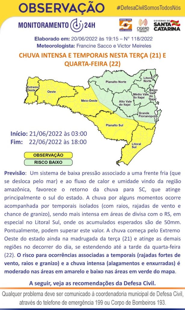 “Um sistema de baixa pressão associado a uma frente fria (que se desloca pelo mar) e ao fluxo de calor e umidade vindo da região amazônica, favorece o retorno da chuva em SC, que atinge principalmente o Sul do Estado. A chuva por alguns momentos ocorre acompanhada por temporais isolados (com raios, rajadas de vento e com chance de granizo), sendo mais intensa em áreas de divisa com o RS, em especial no Litoral Sul, onde os acumulados esperados são de 50mm. Pontualmente, podem superar este valor. A chuva começa pelo Extremo Oeste do Estado, ainda na madrugada de terça (21) e atinge as demais regiões no decorrer do dia, se estendendo até a tarde da quarta-feira (22)”, informou a Defesa Civil.