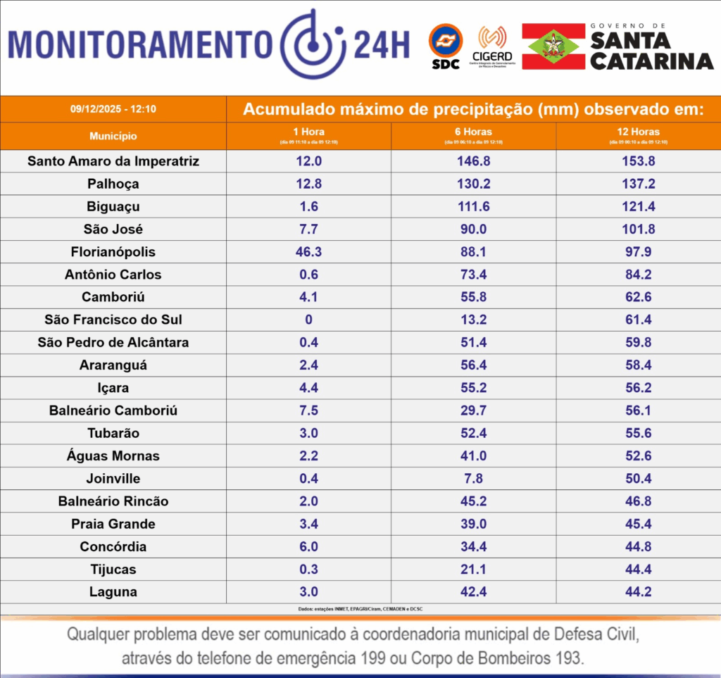 Nas primeiras horas da manhã, a chuva foi persistente, especialmente no Litoral. Os municípios da Grande Florianópolis registraram os maiores acumulados em seis horas: Santo Amaro da Imperatriz ultrapassou 146 mm, Palhoça somou 130 mm, Biguaçu chegou a 111 mm e Florianópolis acumulou quase 90 mm. O acumulado ultrapassou o esperado para o mês de dezembro na região – cerca de 130 mm. No Oeste, os temporais ocorreram de forma isolada, ocasionando também alagamentos e destelhamentos.