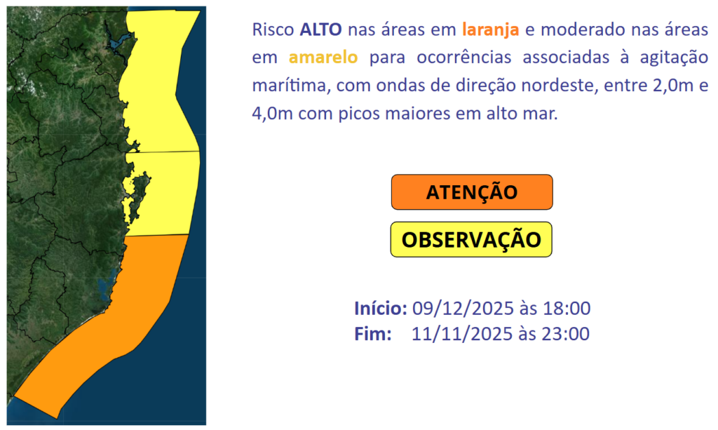 A agitação marítima também aumenta entre quarta e quinta-feira, 11, com risco de ressaca. As ondas de direção nordeste e posteriormente de sul/sudoeste ficam em torno de 2,0 m no Litoral Norte e Baixo Vale do Itajaí, entre 2,0 m e 3,0 m na região da Grande Florianópolis e entre 3,0 m e 4,0 m no Litoral Sul, com picos ainda maiores em alto mar.