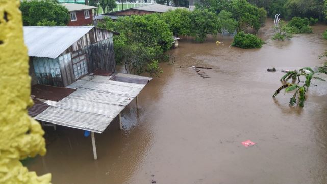 O colunista do ClicRDC, Dr. Írio Grolli, mandou o registro de como o rio Uruguai invadiu o balneário de Ilha Redonda, em Palmitos. A imagem é da tarde desta quarta-feira (12).