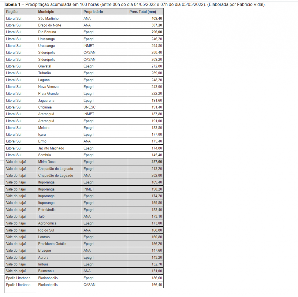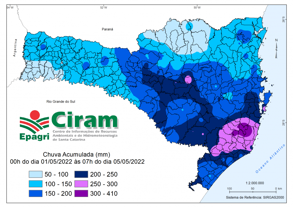 O volume de chuva dos primeiros dias de maio superou a média climatológica do mês na maioria dos municípios de Santa Catarina, especialmente nas regiões do centro ao sul do Estado, onde foram registrados valores acima de 250mm nesse período. No mapa da Figura 1 e na Tabela 1 observa-se a chuva registrada entre 0h do dia 01 e 7h do dia 05/05, que ocorreu de forma persistente, resultando em alagamentos, com elevação do nível dos rios (ver Aviso Hidrológico), e deslizamentos de encosta. O maior registro, de 409,40mm, ocorreu em São Martinho, no Litoral Sul, que representa quatro vezes a chuva esperada no mês inteiro de maio. Em Florianópolis, Mirim Doce (Vale do Itajaí) e Braço do Norte (Litoral Sul), os totais ficaram entre 270 e 300mm.