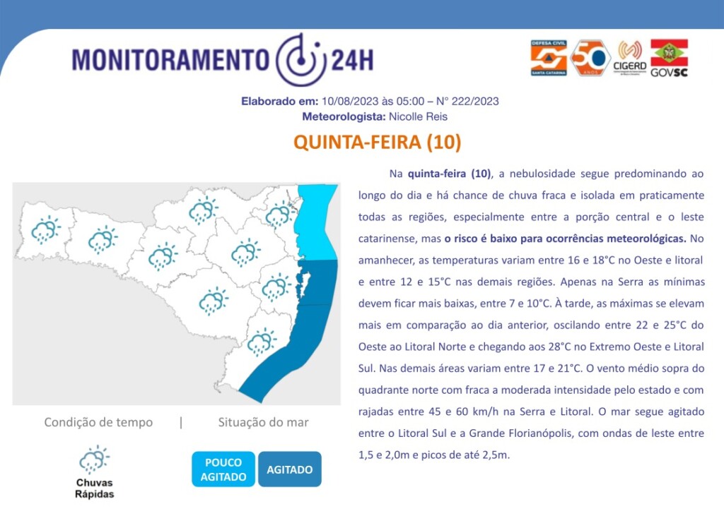 De acordo com o monitoramento da Defesa Civil, pela manhã, as temperaturas variam entre 16º e 18º no Oeste e litoral e entre 12º e 15º nas demais regiões. Apenas na serra as mínimas devem ficar mais baixas, entre 7º e 10º.