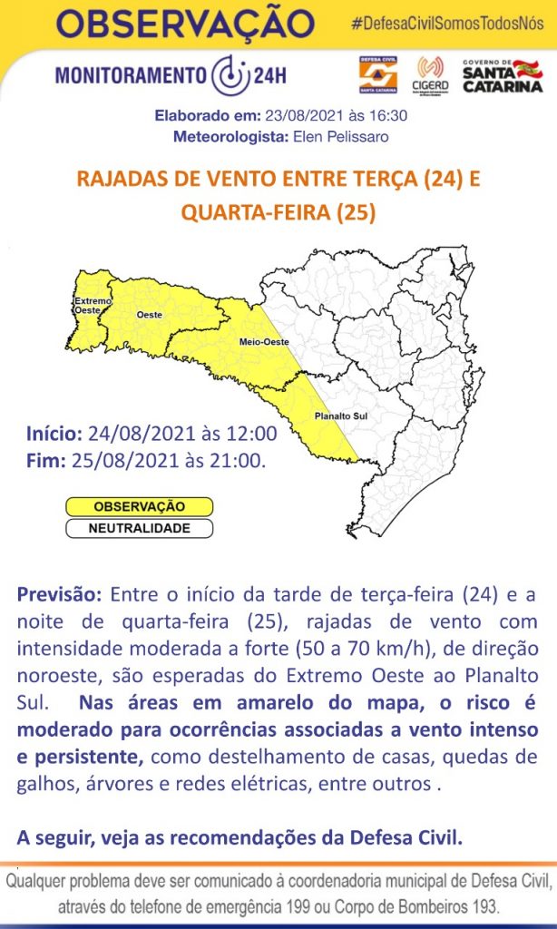 A Defesa Civil divulgou um alerta para fortes rajadas de ventos entre o Extremo Oeste e o Planalto Sul de Santa Catarina. Segundo o órgão estadual, nestas regiões o risco é moderado para vento intenso, com possibilidade de destelhamento de casas, quedas de galhos, árvores e redes elétricas.
