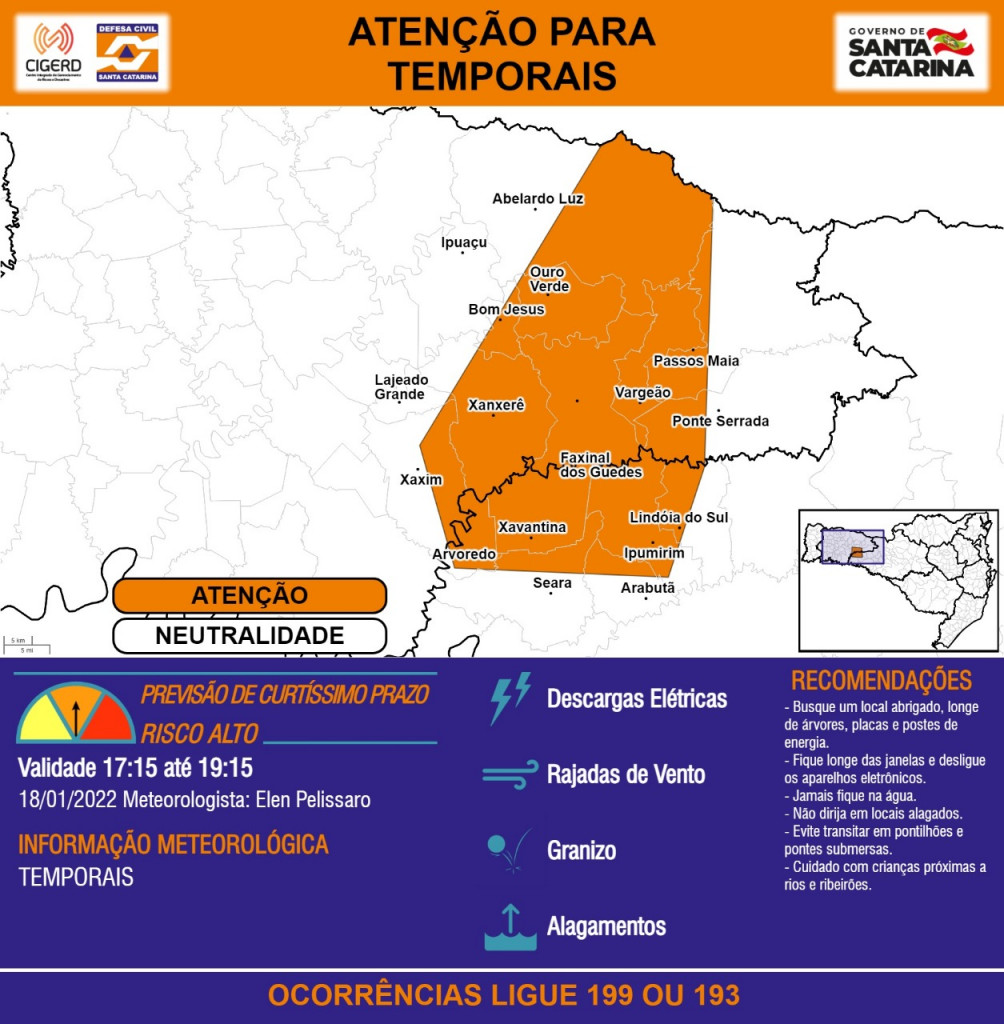 “ATENÇÃO – 18/01 17:15 – TEMPORAIS, com DESCARGAS ELÉTRICAS, RAJADAS DE VENTO, GRANIZO e ALAGAMENTOS, para os municípios de Abelardo Luz, Arabutã, Arvoredo, Bom Jesus, Faxinal dos Guedes, Ipuaçu, Ipumirim, Lajeado Grande, Lindóia do Sul, Ouro Verde, Passos Maia, Ponte Serrada, Seara, Vargeão, Xanxerê, Xavantina e Xaxim nas próximas 2 horas. Ocorrências ligue 199 ou 193”, informou a Defesa Civil.