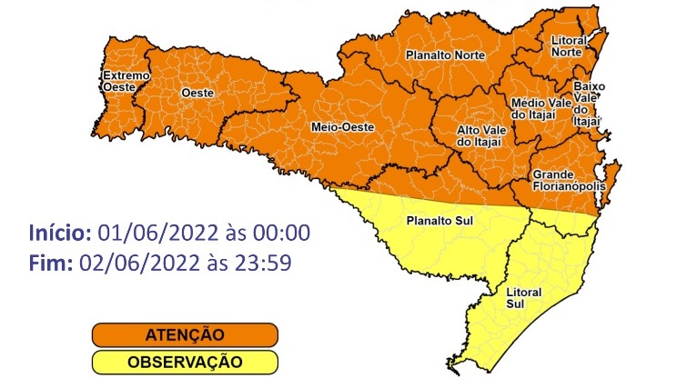 Na manhã desta terça-feira (31), a Defesa Civil de Santa Catarina emitiu um alerta meteorológico cuja previsão já foi adiantada pelo ClicRDC na segunda-feira (30). Estão sendo projetadas chuvas de grande volume nesta quarta e quinta-feira (01 e 02 de junho), nas regiões Oeste, Vale do Itajaí, Norte e parte do Planalto Sul e da Grande Florianópolis.