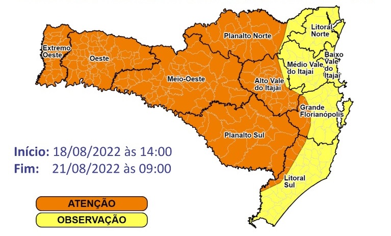 A Defesa Civil de Santa Catarina alerta que após o deslocamento de uma frente fria que deve trazer chuva volumosa e temporais para o Oeste do estado, a partir da tarde de quinta-feira (18), chegará uma massa de ar polar à região, derrubando as temperaturas.