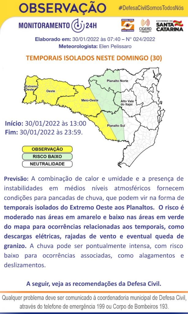 A Defesa Civil emitiu um alerta meteorológico para o Oeste de Santa Catarina, para ocorrências de temporais isolados, com descargas elétricas, rajadas de vento e eventual queda de granizo. Conforme o órgão estadual, a precipitação deve atingir a região entre às 13h e 23h59, deste domingo (30).