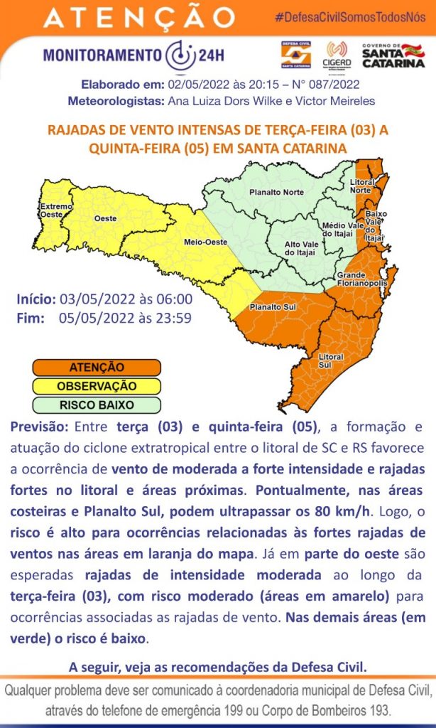 De acordo com a Defesa Civil, as fortes rajadas de vento devem atingir o Litoral de Santa Catarina e áreas próximas. Pontualmente, os ventos podem ultrapassar os 80 km/h, nas áreas costeiras e Planalto Sul do Estado.