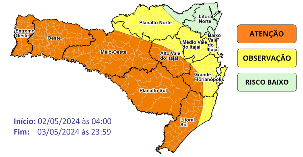 Nas áreas do Meio-Oeste, Planalto Sul, Litoral Sul e nas regiões em laranja do Alto Vale do Itajaí e Grande Florianópolis, prevê-se um volume em torno de 100 mm. É importante ressaltar que as previsões meteorológicas podem variar em relação à posição da frente fria, o que pode resultar em acumulações diferentes das projetadas, podendo ser tanto subestimadas quanto superestimadas.