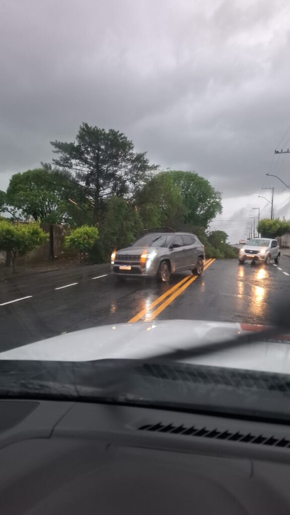 Trânsito interrompido: Em Xanxerê, a BR-282 está totalmente bloqueada no km 493 devido à queda de várias árvores sobre a pista. As equipes trabalham na remoção dos galhos e limpeza da via, e a liberação é prevista para cerca de duas horas, conforme informações atualizadas das autoridades locais.