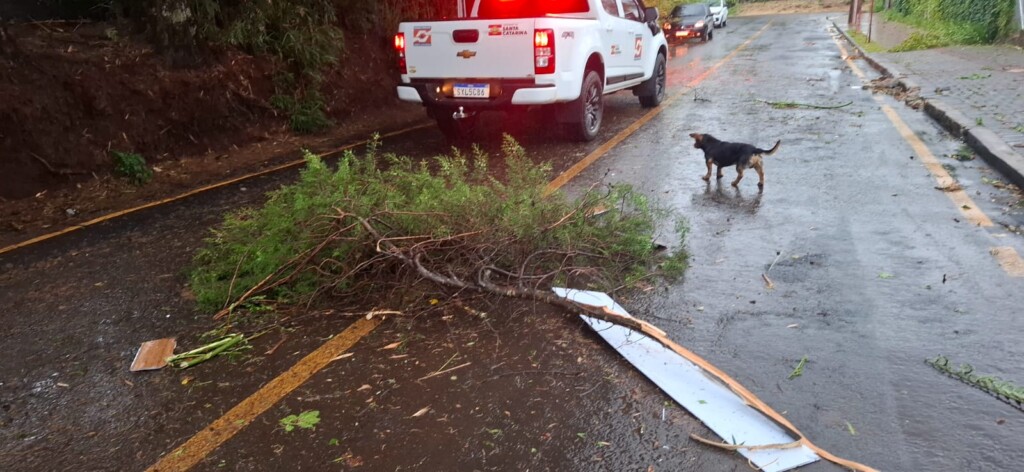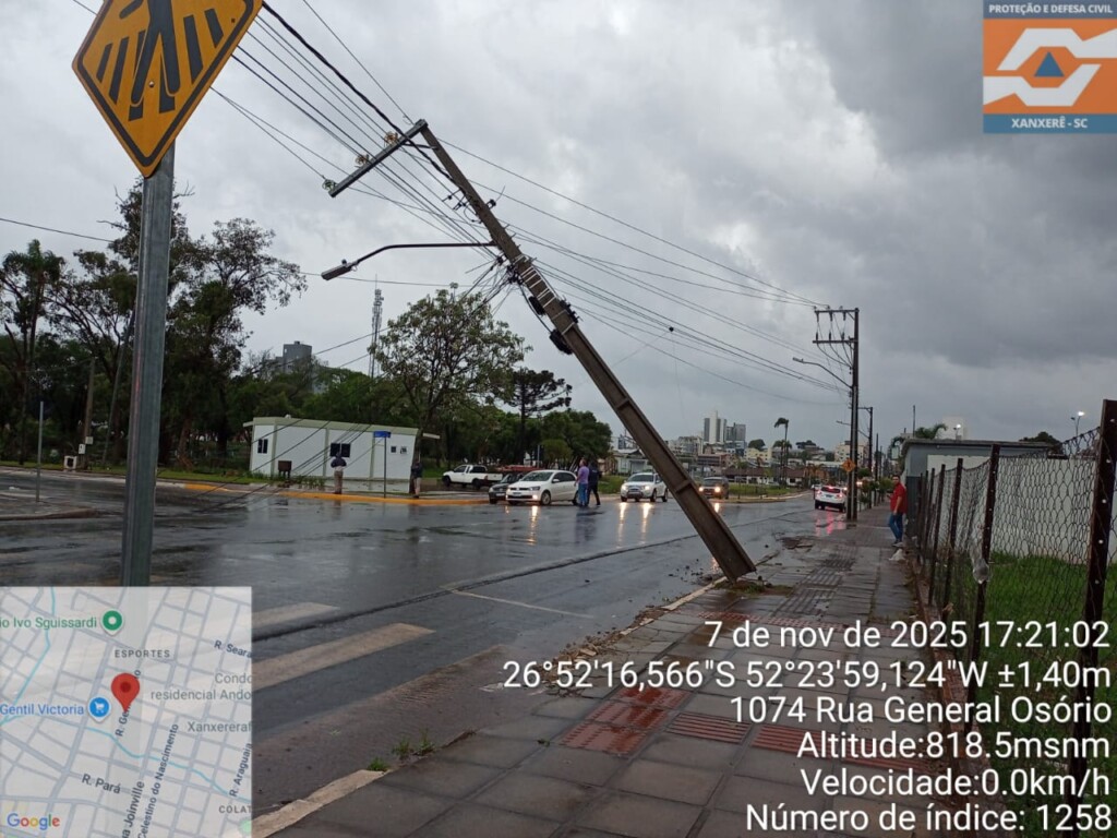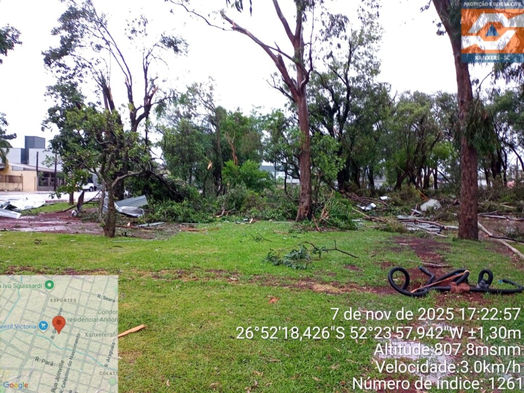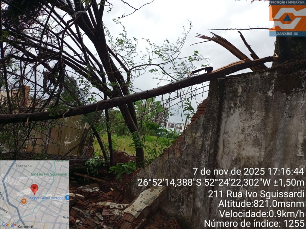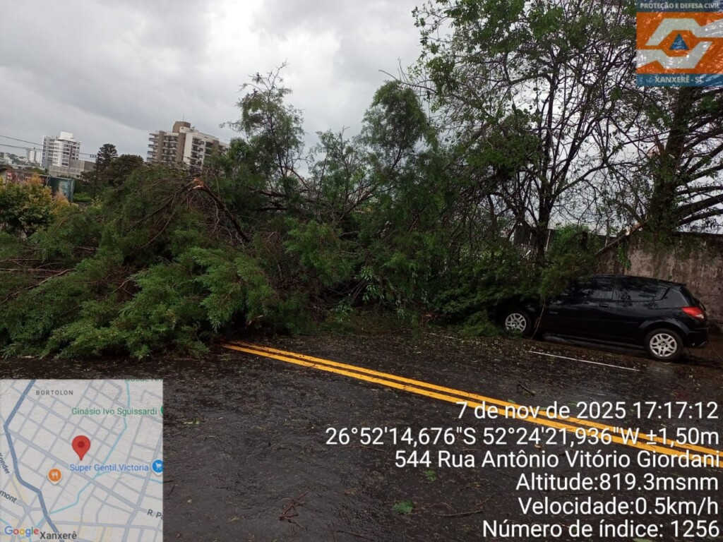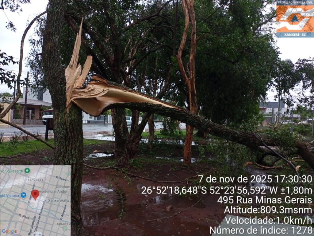 Já em Xanxerê, por volta das 17h, a Coordenadoria Municipal de Proteção e Defesa Civil registrou uma tempestade acompanhada de rajadas intensas de vento, que provocou diversos danos materiais em diferentes regiões da cidade. Houve destelhamentos, queda de árvores, postes e estruturas metálicas, além de danos em fachadas e muros. As principais áreas atingidas foram os bairros Central, Colatto e Frederico Ferronato.