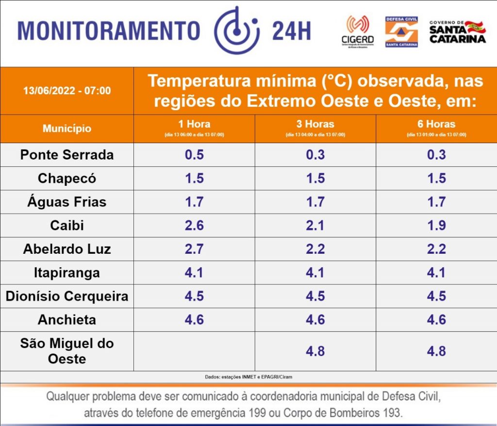 Esta segunda-feira (13) amanheceu com temperaturas baixas em todo o estado de Santa Catarina. De acordo com a Defesa Civil, em Chapecó, a temperatura ficou em 1,5°C durante a madrugada e em outras cidades do Oeste, as temperaturas ficaram negativas, como é o caso de Ponte Serrada onde as mínimas foram de 0,5°.