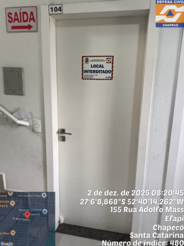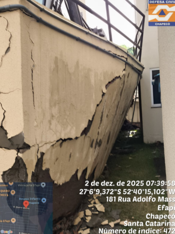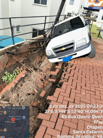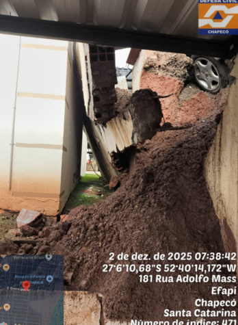 Entre as principais ocorrências, a Defesa Civil destaca a interdição de portas e acessos de unidades habitacionais na Efapi devido ao risco estrutural; a ruptura de um muro de contenção que arrastou um veículo; o afundamento de parte de um estacionamento com danos à cobertura metálica; a queda de uma árvore em praça pública no Centro; e alagamentos pontuais no bairro Maria Goretti, tanto em residência quanto em via pública.