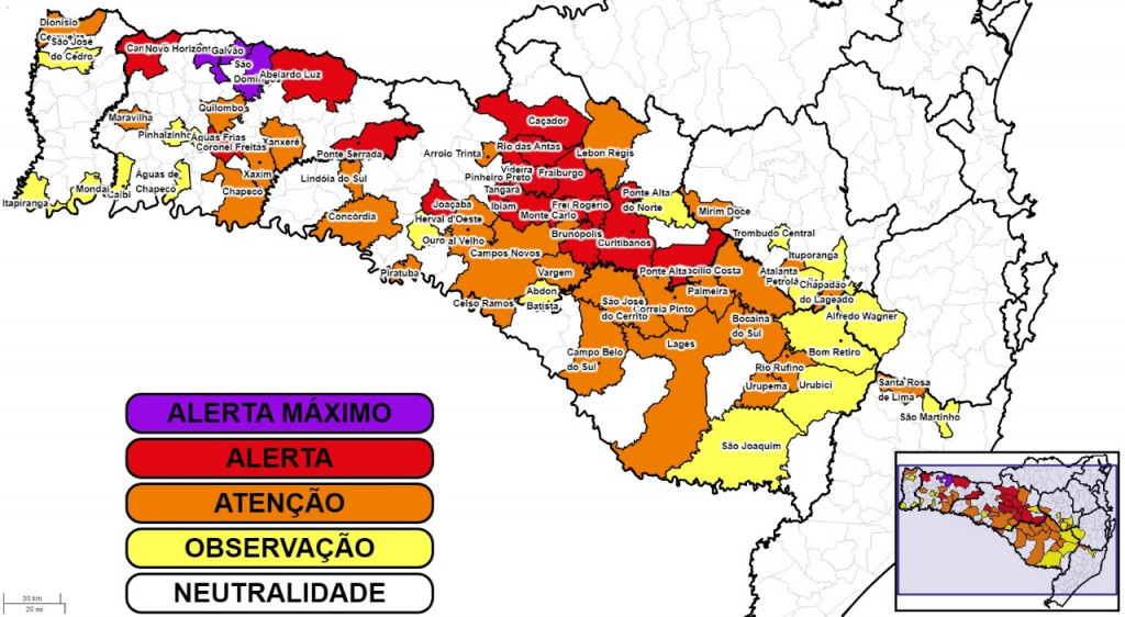 Os municípios de Galvão, Novo Horizonte e São Domingos estão em alerta máximo para este tipo de ocorrência. Boa parte da região de Caçador e a cidade de Joaçaba estão em alerta vermelho. Chapecó, Concórdia, Maravilha e Xanxerê são os principais municípios da região em alerta laranja. É importante levar em conta esse alerta durante todo o dia.