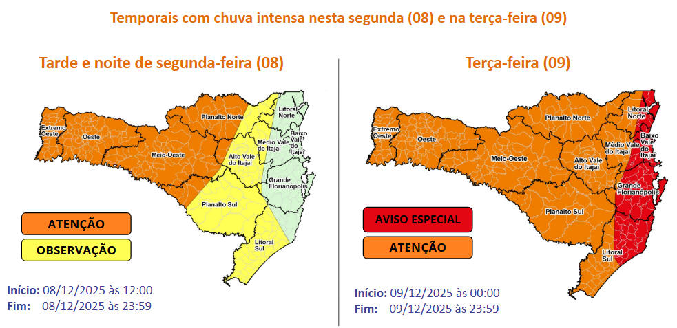 A atuação de um ciclone extratropical considerado atípico coloca Santa Catarina em estado de atenção entre esta segunda-feira (8) e quinta-feira (11). De acordo com a Secretaria de Estado da Proteção e Defesa Civil (SDC/SC) e a Epagri/Ciram, o sistema provoca temporais, chuva intensa, rajadas de vento, risco de alagamentos, enxurradas e até ressaca no litoral, com maior impacto entre segunda e terça-feira.
